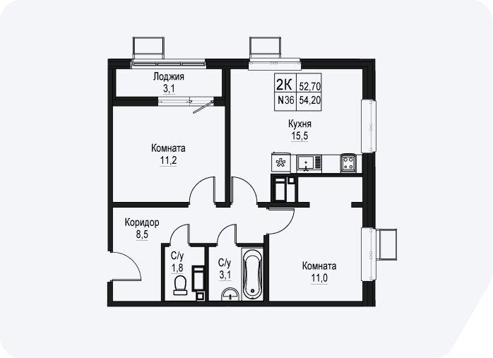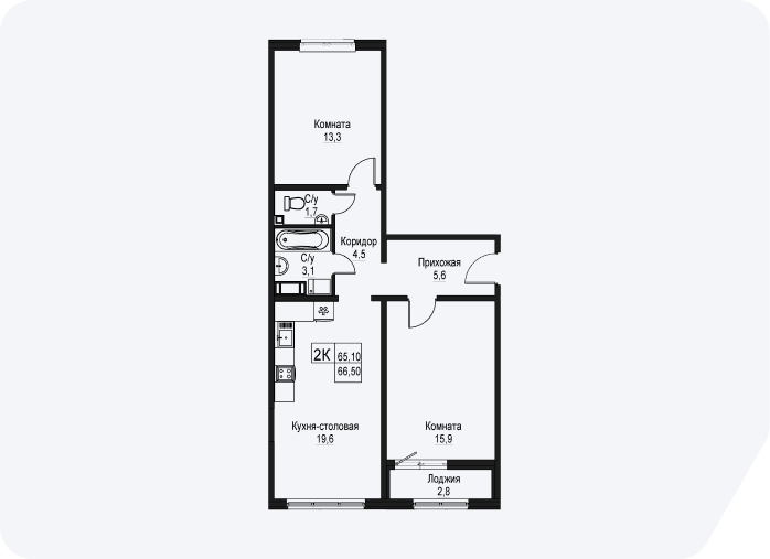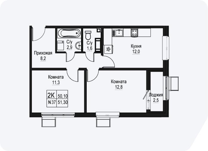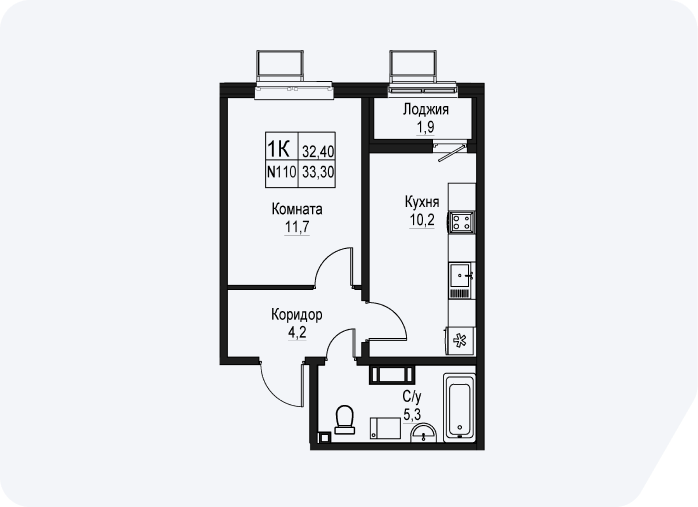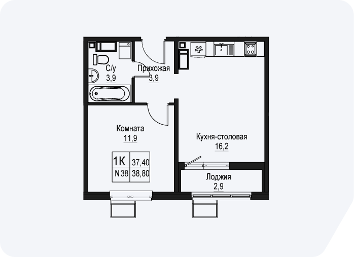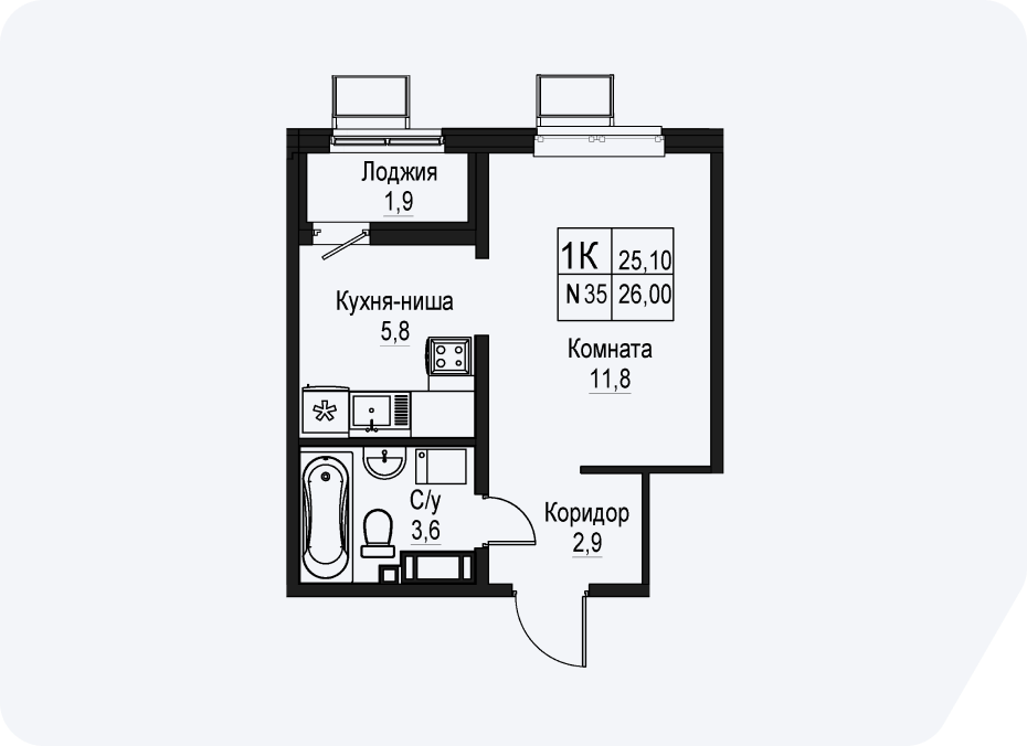 - санитарные бытовые приборы: акриловая ванна с экраном, душевой поддон (в студии), мойка, раковина, унитаз